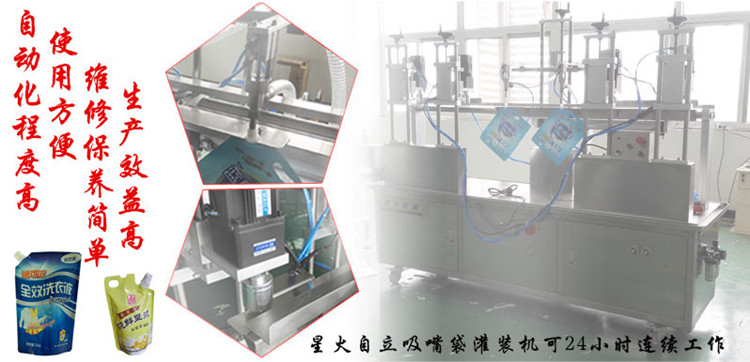 星火機(jī)械專業(yè)生產(chǎn)自立吸嘴袋灌裝機(jī),整機(jī)采用氣電相結(jié)合,只需人工上袋、上蓋,就能夠?qū)崿F(xiàn)自動(dòng)灌裝(兩次)、旋蓋、退袋等一系列工序,達(dá)到節(jié)能高效的目的;可根據(jù)客戶需求要增減部分功能;該機(jī)與物料接觸部分均采用304不銹鋼材料制作,產(chǎn)品衛(wèi)生,機(jī)器造型美觀,外觀光亮整潔;該機(jī)的自動(dòng)旋蓋裝置采用磁力+齒輪旋蓋、壓力可調(diào),袋蓋緊實(shí)不遺漏、具有自動(dòng)打滑功能使旋蓋松緊適當(dāng);該機(jī)帶有光電眼監(jiān)測(cè)袋蓋裝置,無袋不灌裝,無蓋可及時(shí)報(bào)警提醒操作人員檢查,及時(shí)調(diào)整,避免浪費(fèi)。
